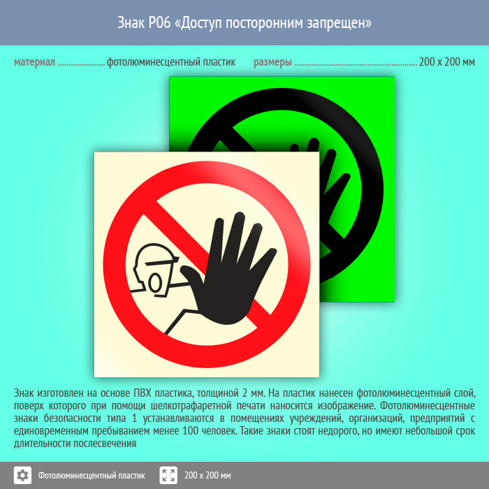 Знак P06 «Доступ посторонним запрещен» (фотолюминесцентный пластик, 200х200 мм) в Волгограде купить