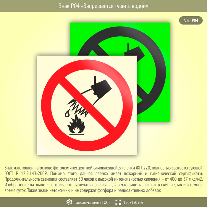 Знак P04 «Запрещается тушить водой» (фотолюминесцентная пленка ГОСТ 34428-2018, 150х150 мм) в Волгограде купить