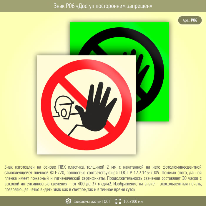 Знак P06 «Доступ посторонним запрещен» (фотолюминесцентный пластик ГОСТ 34428-2018, 100х100 мм) в Волгограде купить