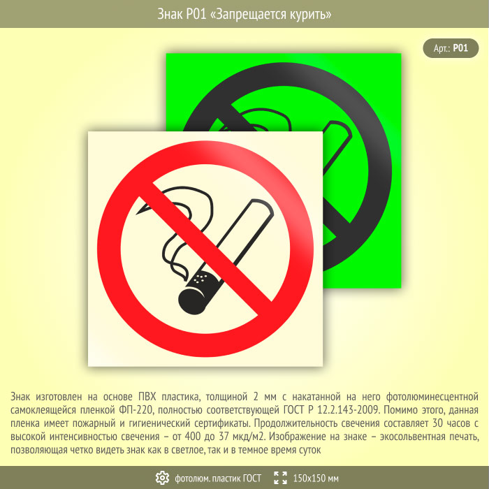 Знак P01 «Запрещается курить» (фотолюминесцентный пластик ГОСТ 34428-2018, 150х150 мм) в Волгограде купить