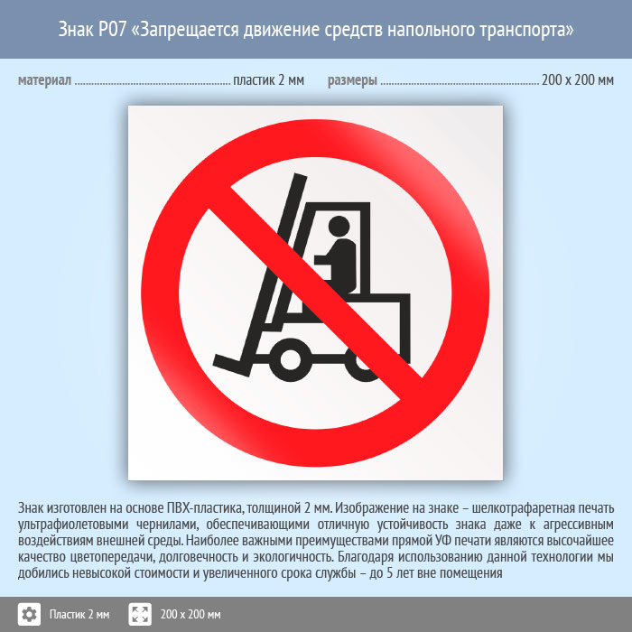 Знак P07 «Запрещается движение средств напольного транспорта» (пластик, 200х200 мм) в Волгограде купить