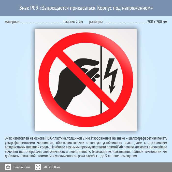 Знак P09 «Запрещается прикасаться. Корпус под напряжением» (пластик, 200х200 мм) в Волгограде купить