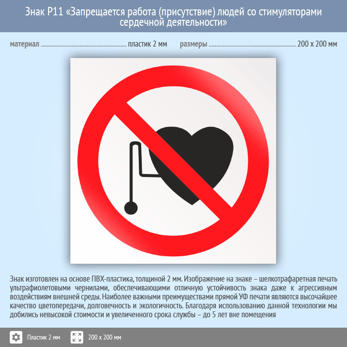 Знак P11 «Запрещается работа (присутствие) людей со стимуляторами сердечной деятельности» (пластик, 200х200 мм) в Волгограде купить
