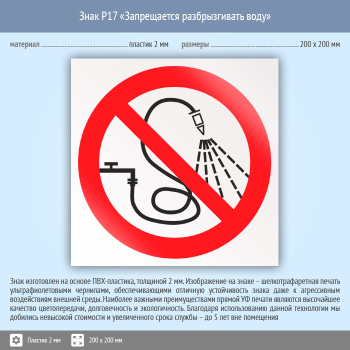 Знак P17 «Запрещается разбрызгивать воду» (пластик, 200х200 мм) в Волгограде купить