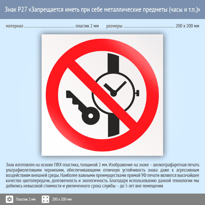 Знак P27 «Запрещается иметь при (на) себе металлические предметы (часы и т.п.)» (пластик, 200х200 мм) в Волгограде купить