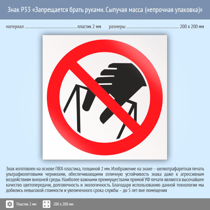 Знак P33 «Запрещается брать руками. Сыпучая масса (непрочная упаковка)» (пластик, 200х200 мм) в Волгограде купить