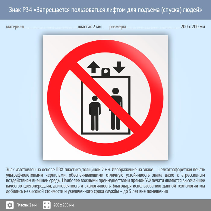 Знак P34 «Запрещается пользоваться лифтом для подъема (спуска) людей» (пластик, 200х200 мм) в Волгограде купить