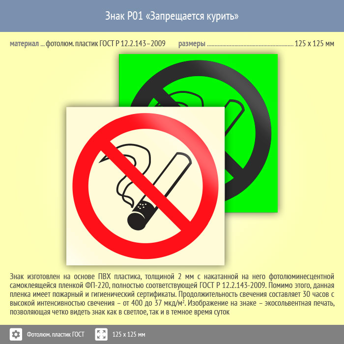 Знак P01 «Запрещается курить» (фотолюминесцентный пластик ГОСТ 34428-2018, 125х125 мм) в Волгограде купить