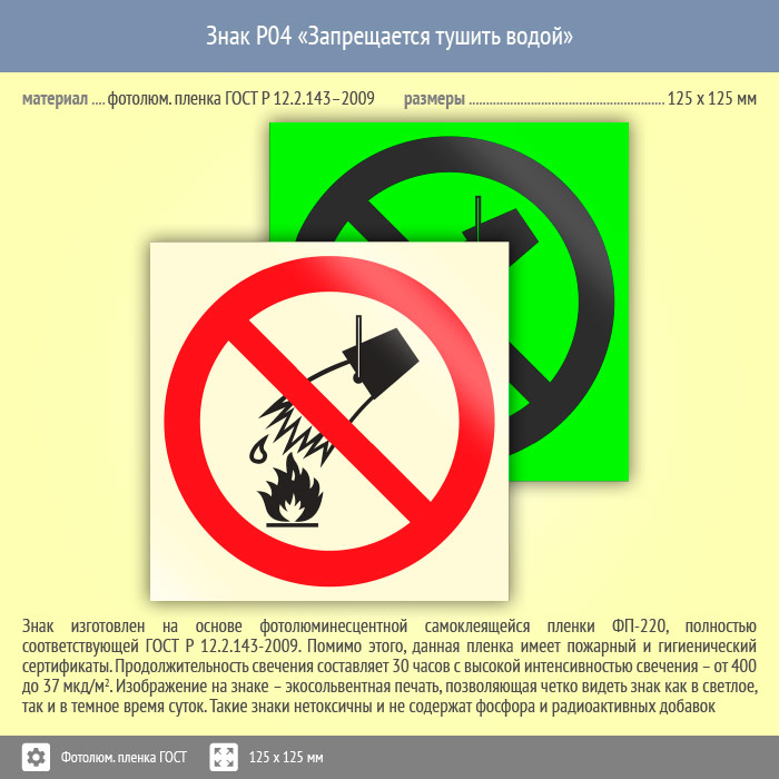 Знак P04 «Запрещается тушить водой» (фотолюминесцентная пленка ГОСТ 34428-2018, 125х125 мм) в Волгограде купить