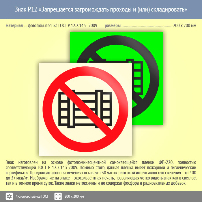 Знак P12 «Запрещается загромождать проходы и (или) складировать» (фотолюминесцентная пленка ГОСТ 34428-2018, 200х200 мм) в Волгограде купить