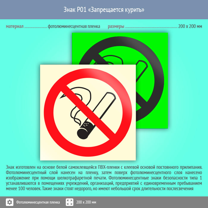 Знак P01 «Запрещается курить» (фотолюминесцентная пленка, 200х200 мм) в Волгограде купить