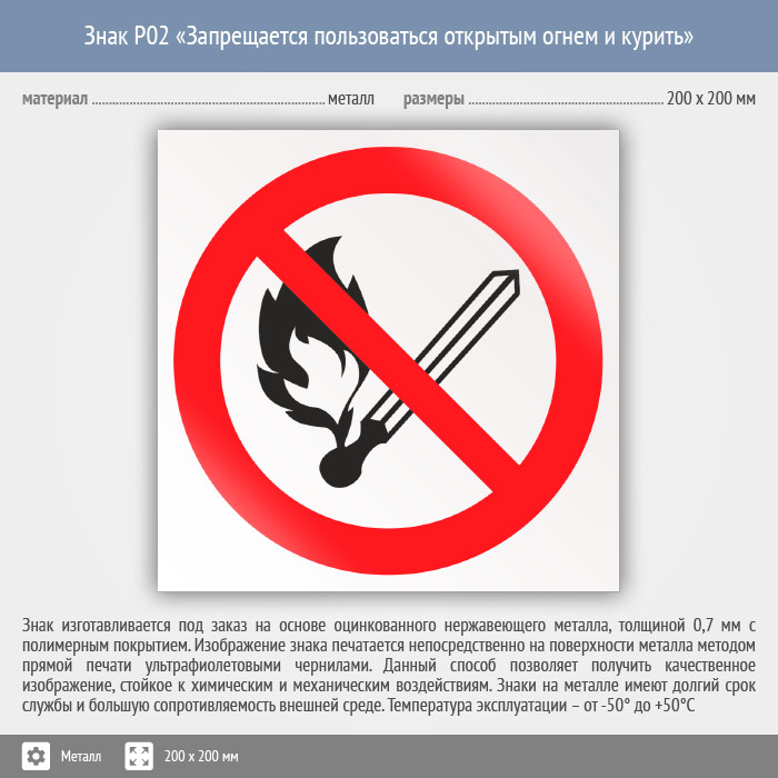 Знак P02 «Запрещается пользоваться открытым огнем и курить» (металл, 200х200 мм) в Волгограде купить