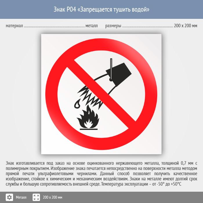 Знак P04 «Запрещается тушить водой» (металл, 200х200 мм) в Волгограде купить