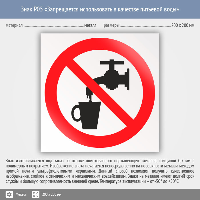 Знак P05 «Запрещается использовать в качестве питьевой воды» (металл, 200х200 мм) в Волгограде купить