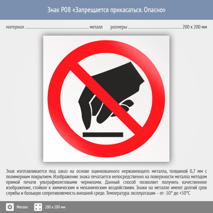Знак P08 «Запрещается прикасаться. Опасно» (металл, 200х200 мм) в Волгограде купить
