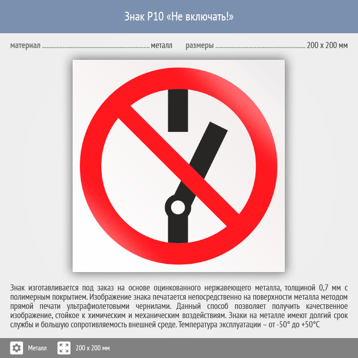 Знак P10 «Не включать!» (металл, 200х200 мм) в Волгограде купить