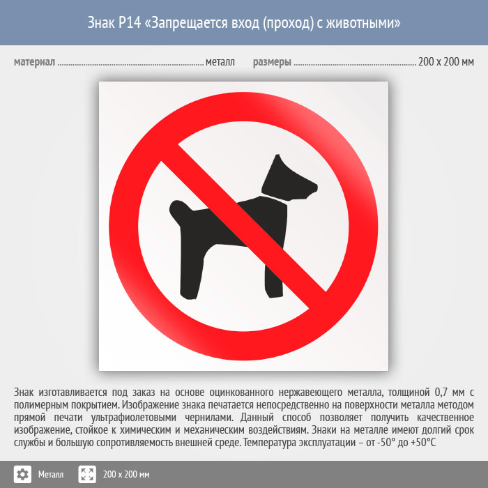 Знак P14 «Запрещается вход (проход) с животными» (металл, 200х200 мм) в Волгограде купить