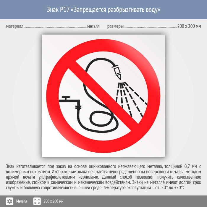 Знак P17 «Запрещается разбрызгивать воду» (металл, 200х200 мм) в Волгограде купить