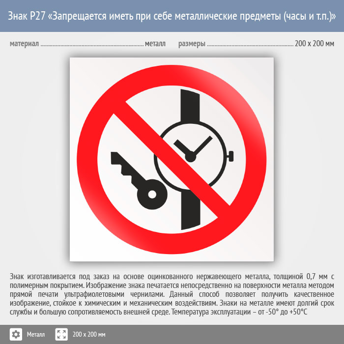 Знак P27 «Запрещается иметь при (на) себе металлические предметы (часы и т.п.)» (металл, 200х200 мм) в Волгограде купить