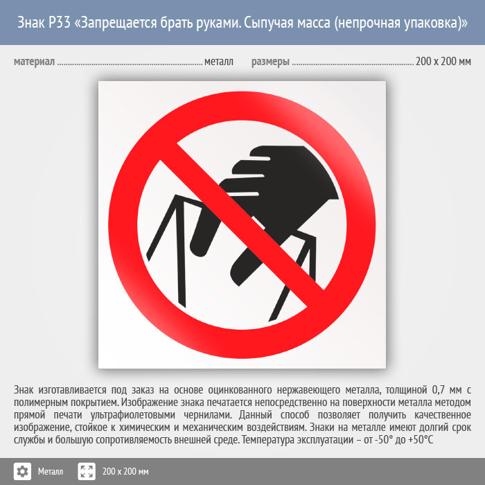 Знак P33 «Запрещается брать руками. Сыпучая масса (непрочная упаковка)» (металл, 200х200 мм) в Волгограде купить