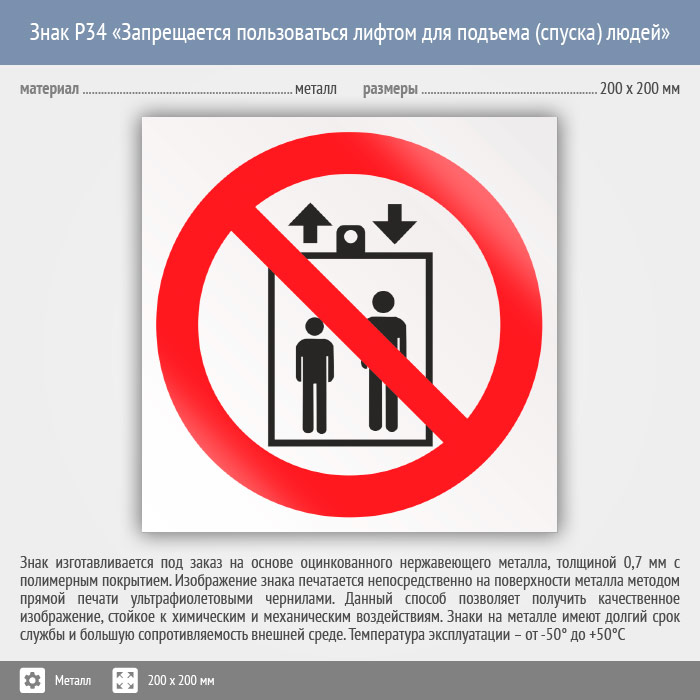 Знак P34 «Запрещается пользоваться лифтом для подъема (спуска) людей» (металл, 200х200 мм) в Волгограде купить