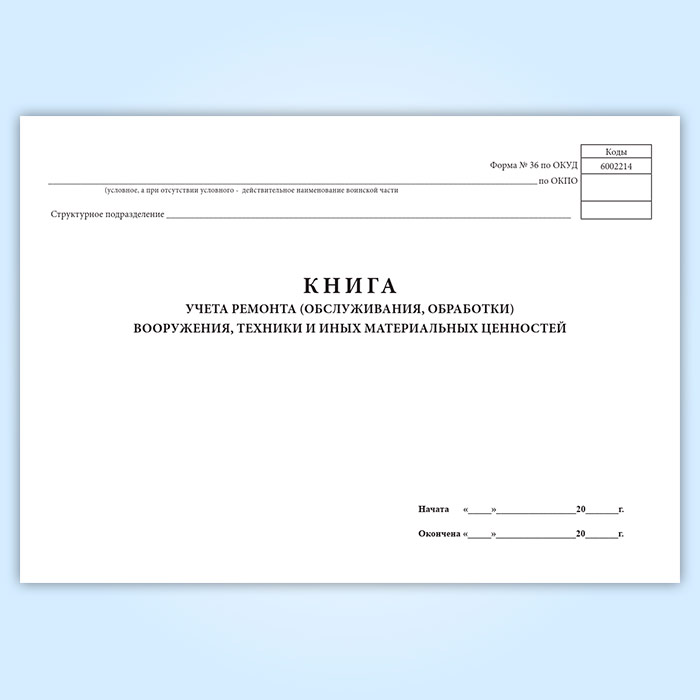 Книга учета ремонта (обслуживания, обработки) вооружения, техники и иных материальных ценностей (форма 36) в Волгограде купить