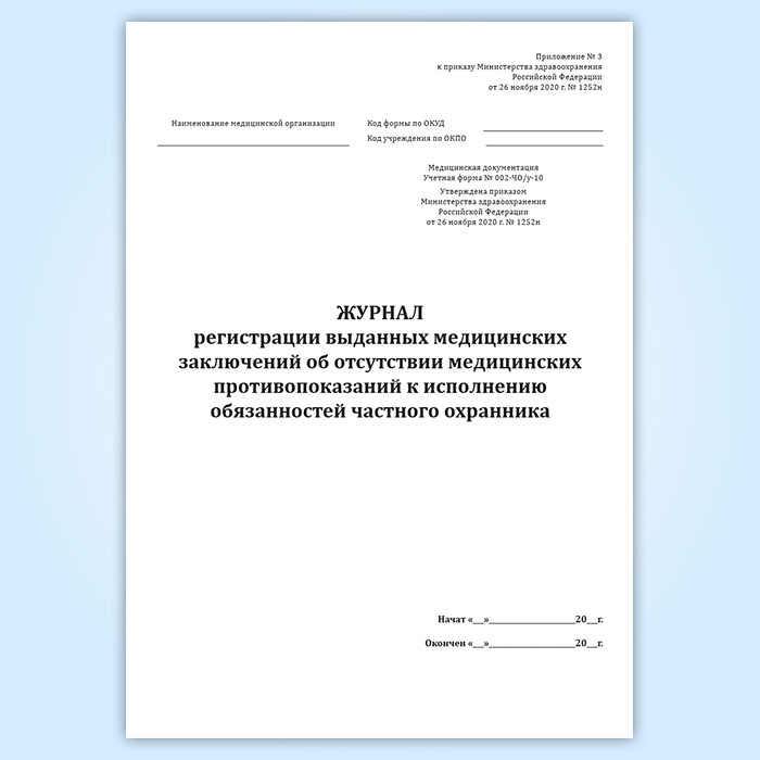 Журнал регистрации выданных медицинских заключений об отсутствии медицинских противопоказаний к исполнению обязанностей частного охранника (учетная форма № 002-ЧО/у-10) в Волгограде купить