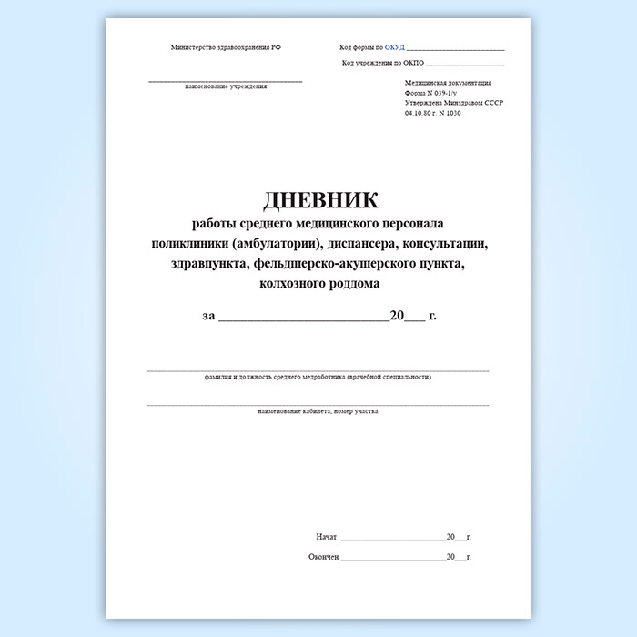 Дневник работы среднего медицинского персонала поликлиники (амбулатории), диспансера, консультации, здравпункта, фельдшерско-акушерского пункта, колхозного роддома (форма 039-1/у) в Волгограде купить