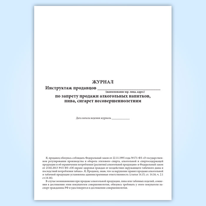 Журнал инструктажа продавцов по запрету продажи алкогольных напитков, пива, сигарет несовершеннолетним в Волгограде купить