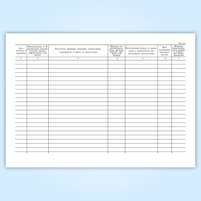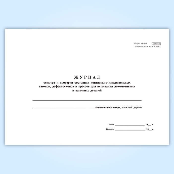 Журнал осмотра и проверки состояния контрольно-измерительных вагонов, дефектоскопов и прессов для испытания локомотивных и вагонных деталей (форма ТУ-113) в Волгограде купить