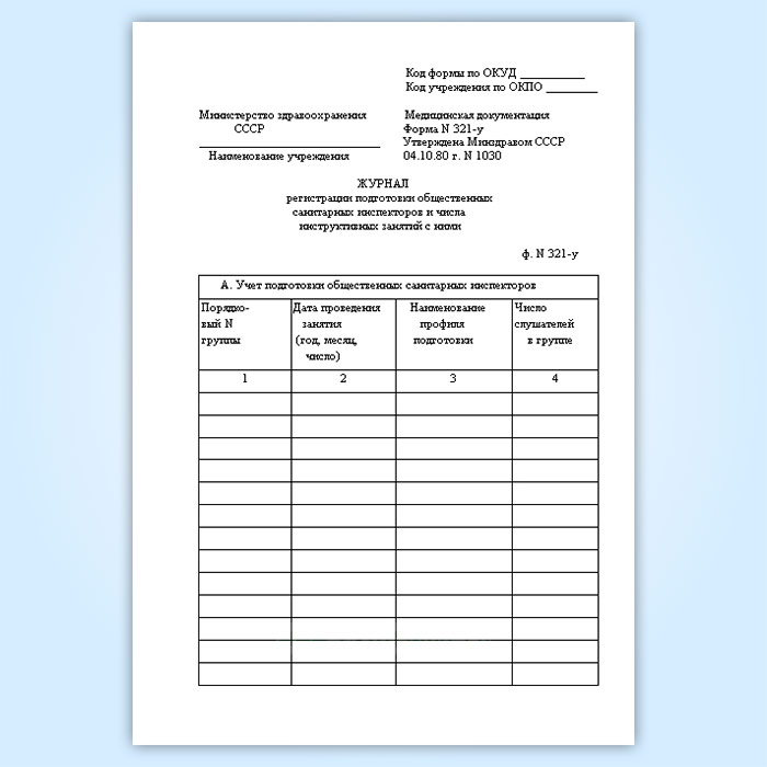 Журнал регистрации подготовки общественных санитарных инспекторов и числа инструктивных занятий с ними (форма № 321-у) в Волгограде купить