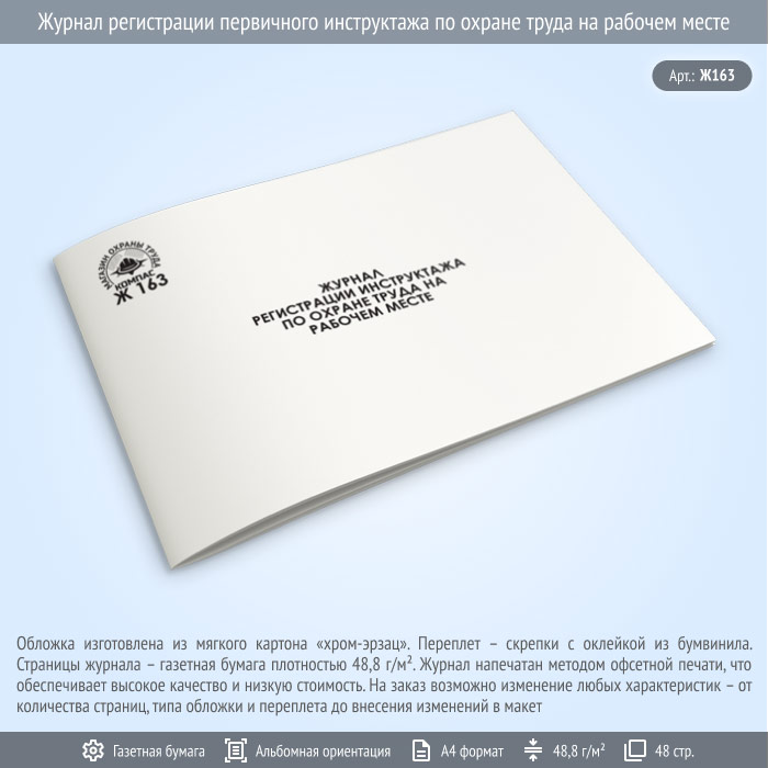 Журнал регистрации первичного инструктажа по охране труда на рабочем месте (Ж163, 48 стр.) в Волгограде купить