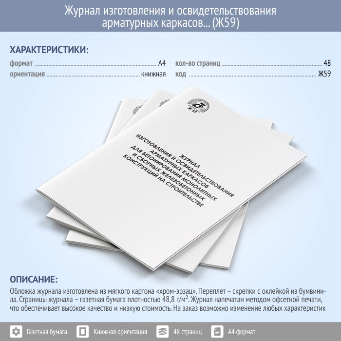 Журнал изготовления и освидетельствования арматурных каркасов для бетонирования монолитных и сборных железобетонных конструкций на строительстве (Ф-48) (48 стр., Ж59) в Волгограде купить