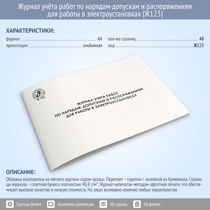 Журнал учета работ по нарядам-допускам и распоряжениям для работы в электроустановках (48 стр., Ж123) в Волгограде купить
