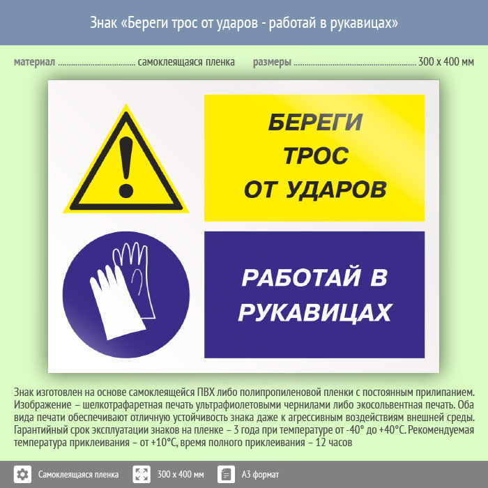 Знак «Береги трос от ударов – работай в рукавицах» может быть изготовлен любого размера на самоклеящейся пленке, пластике толщиной 0.5, 2 или 4 мм и металле. Также возможно применение фотолюминесцентных и световозвращающих материалов