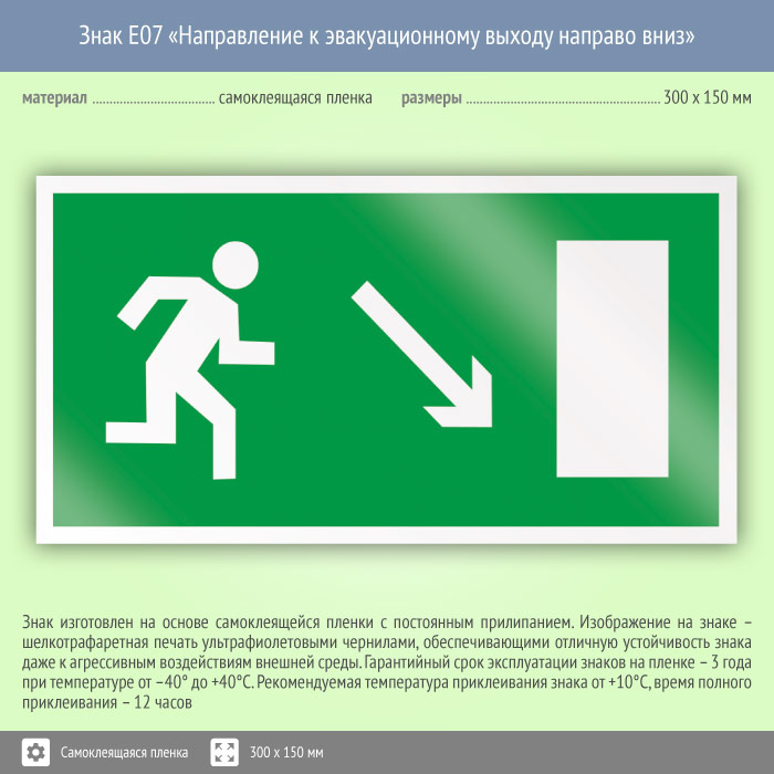 Знак «Направление к эвакуационному выходу направо вниз» направляет к выходу направо и вниз. Код знака: E07