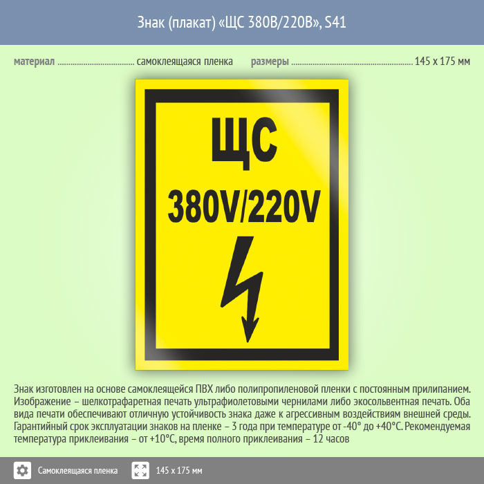 Знак (плакат) «ЩС 380В/220В», S41 (пленка, 145х175 мм)