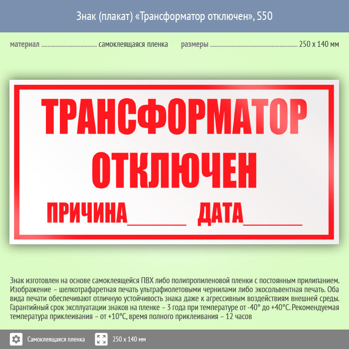 Знак (плакат) «Трансформатор отключен», S50 (пленка, 250х140 мм)