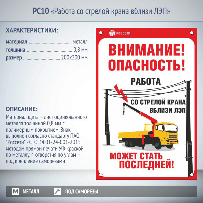 Знак «Работа со стрелой крана вблизи ЛЭП», РС10 (металл, 200х300 мм, отверстия под саморезы) в Волгограде купить