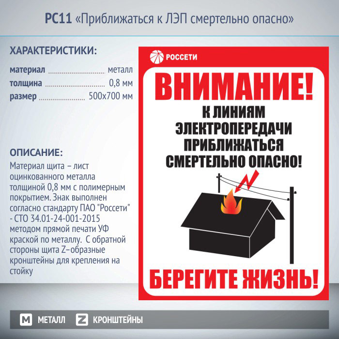 Информационный щит «Приближаться к ЛЭП смертельно опасно», РС11 (металл, 500х700 мм, кронштейны для крепления) в Волгограде купить
