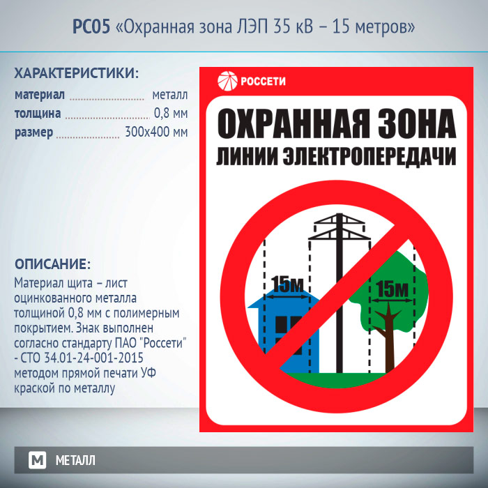 Знак «Охранная зона ЛЭП 35 кВ – 15 метров», РС05 (металл, 300х400 мм) в Волгограде купить