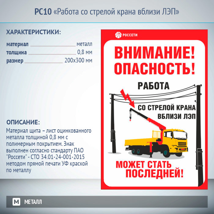 Знак «Работа со стрелой крана вблизи ЛЭП», РС10 (металл, 200х300 мм) в Волгограде купить