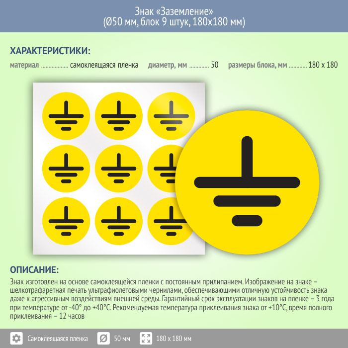 Знак (плакат) «Заземление», S46 (пленка, диаметр 50 мм, блок 9 штук, 180х180 мм) в Волгограде купить