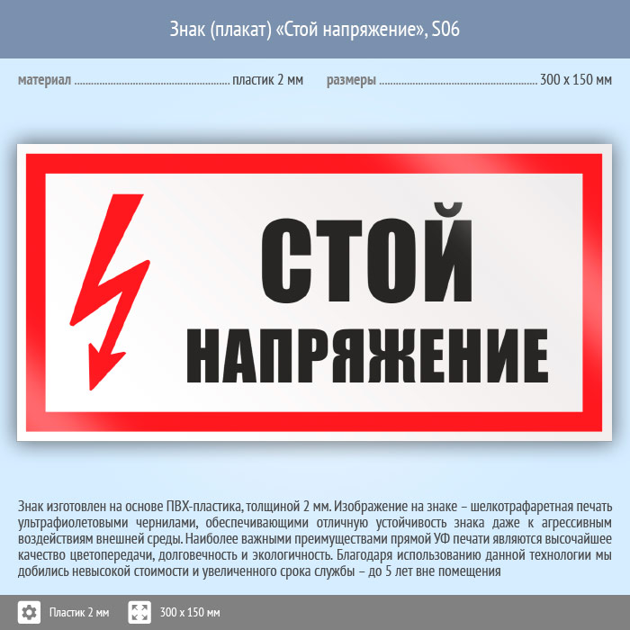 Знак (плакат) «Стой напряжение», S06 (пластик, 300х150 мм) в Волгограде купить