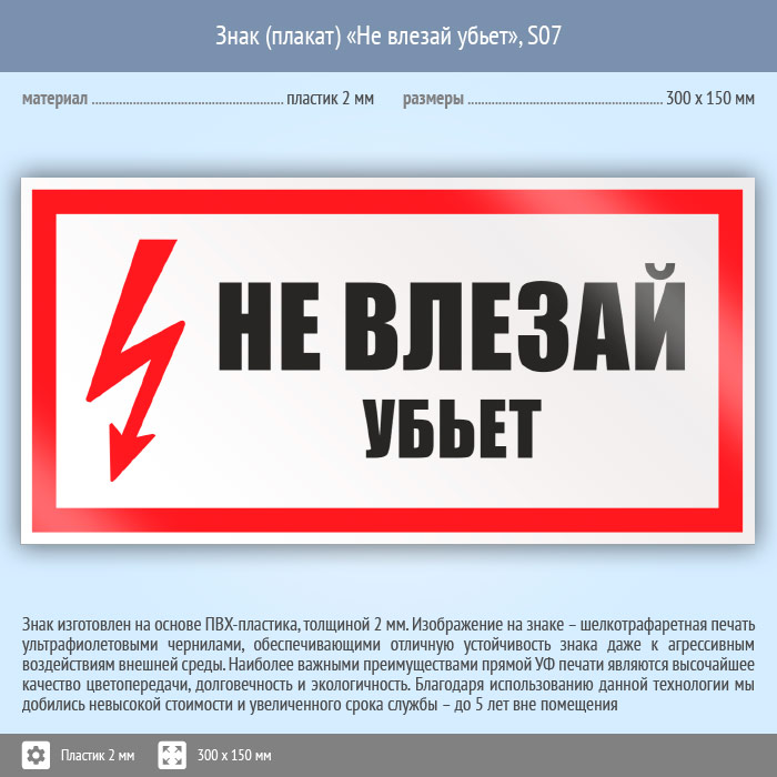 Знак (плакат) «Не влезай убьет», S07 (пластик, 300х150 мм) в Волгограде купить