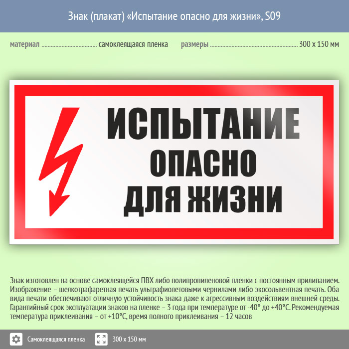 Знак (плакат) «Испытание опасно для жизни», S09 (пленка, 300х150 мм) в Волгограде купить