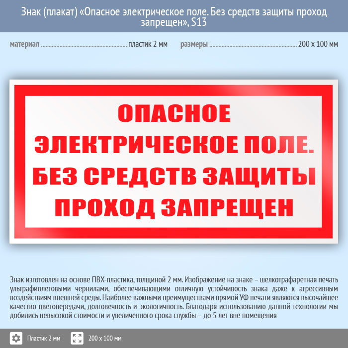 Знак (плакат) «Опасное электрическое поле. Без средств защиты проход запрещен», S13 (пластик, 200х100 мм) в Волгограде купить