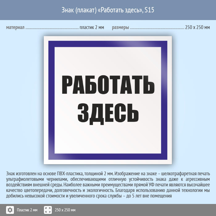 Знак (плакат) «Работать здесь», S15 (пластик, 250х250 мм) в Волгограде купить