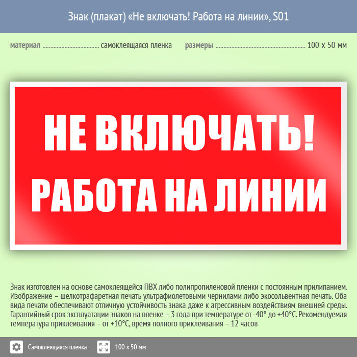 Знак (плакат) «Не включать! Работа на линии», S01 (пленка, 100х50 мм) в Волгограде купить