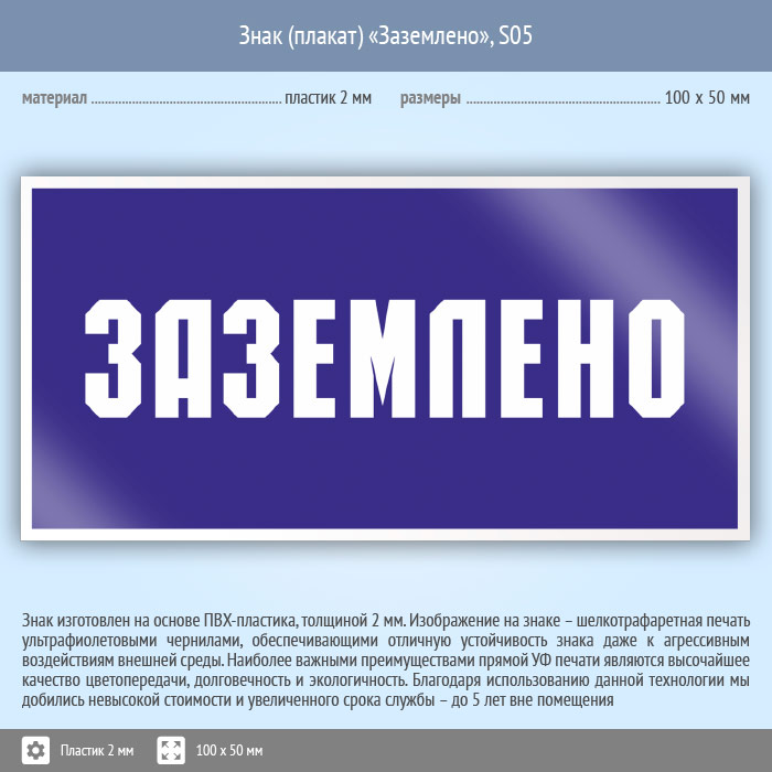 Знак (плакат) «Заземлено», S05 (пластик, 100х50 мм) в Волгограде купить